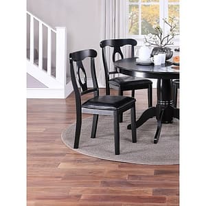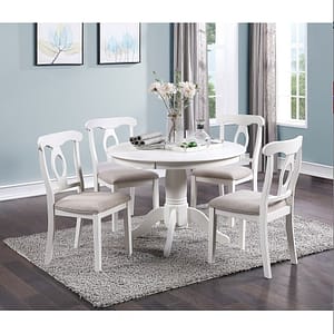 Make your dining room into a perfect hang out spot to have dinner with family and friends. Classic design with solidly constructed wooden top, the round dining table also comes with four sturdy chairs with cushion that provides comfort. Avaiable in your choice of white or black finish.